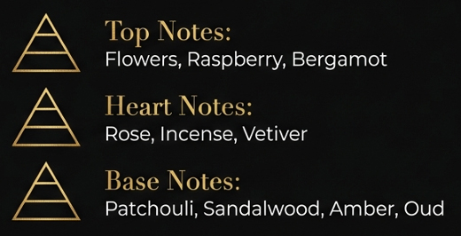Notes: Rose, Pink Berry, Incense, Myrrh, Oud, Sandalwood.