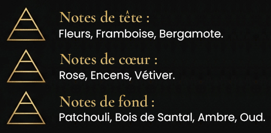 Notes : Rose, Baie Rose, Encens, Myrrhe, Oud, Bois de Santal.